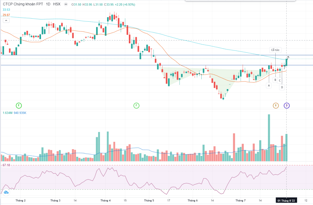 – Điểm A: Phiên có khối lượng rất lớn, xác định có dòng tiền của tổ chức đi vào. Sau điểm A là một cây nến đỏ, có thể phiên sau điểm A là lúc rũ bỏ nhỏ lẻ đu bám ra bớt. Mẫu hình VĐV cũng đã hình thành.
