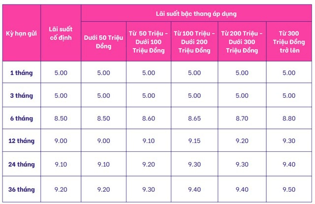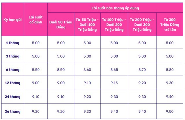 – (18/10/2022): Lãi suất huy động cao nhất hiện tại bây giờ là thuộc về VP Bank với 9.5%/năm áp dụng cho kỳ hạn 36 tháng, số tiền gửi tối thiểu 300tr