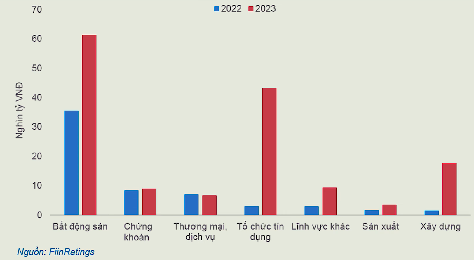 Giá trị đáo hạn phân theo nhóm ngành trong năm 2023 tới thể hiện qua chart bên dưới. Trong đó 40% của nhóm BĐS, 40% của nhóm tài chính, và 20% còn lại thuộc nhóm ngành khác