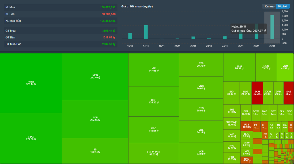 Thêm một điểm nhấn hôm nay nữa là khối ngoại tiếp tục đẩy mạnh mua vào, lượng mua ròng của khối này đạt gần 2640 tỷ, tập trung mua ở nhóm large cap với VHM, HPG, MSN, SSI, VIC. Dường như khối ngoại đang muốn gom thêm trước khi Fubon ETF bắt đầu giải ngân 4000 tỷ vào TTCK VN vào đầu tháng 12. Với sự hỗ trợ thêm về thanh khoản từ khối ngoại, VNI vẫn đang rất tích cực.