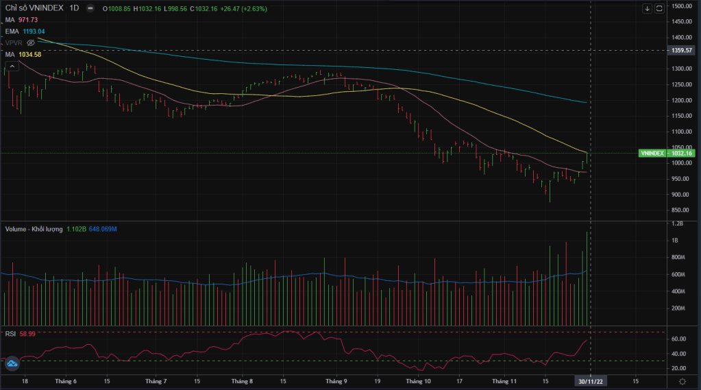 VNINDEX hôm nay chứng kiến đà tăng mạnh với khối lượng còn lớn hơn phiên FTD hôm qua. Hơn 18k tỷ đã được giao dịch, và điểm số tăng thêm 26 điểm lên vùng 1032.