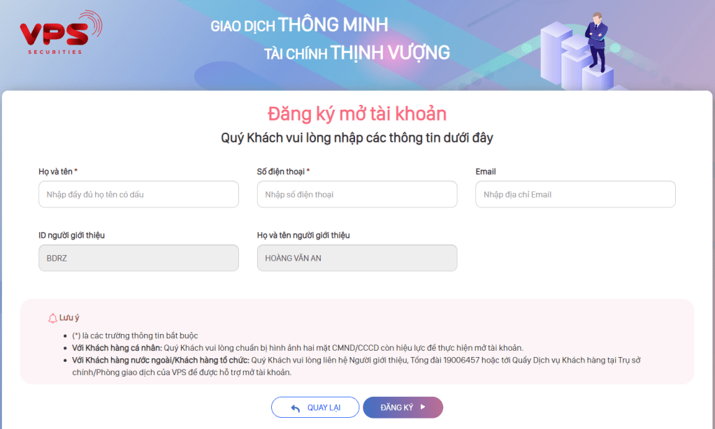 Khi mở tài khoản tại VPS, mọi người nên điền ID người giới thiệu vì dù có hay không thì phí giao dịch vẫn không đổi, trong khi nếu có ID người giới thiệu thì mình sẽ có thêm những thông tin cũng như cảnh báo từ tư vấn viên.