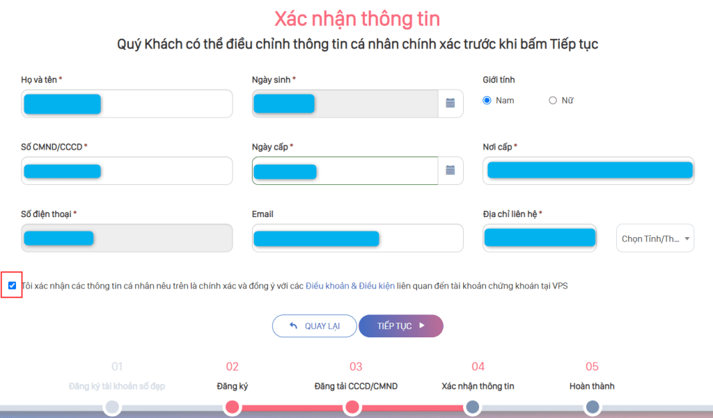 Mọi người kiểm tra lại thông tin cá nhân đã cung cấp đã chính xác hay chưa, sau đó đánh dấu vào ô xác nhận và nhấn Tiếp tục