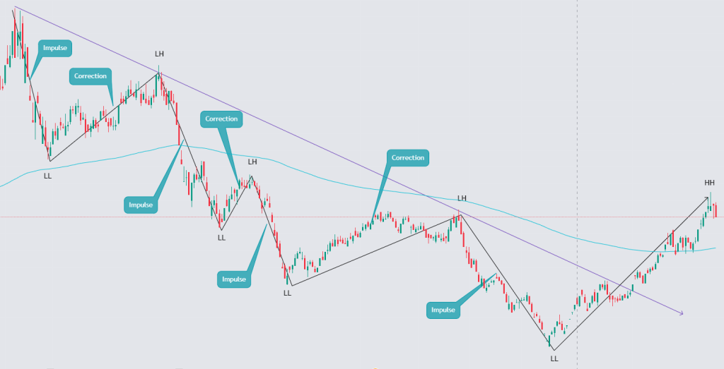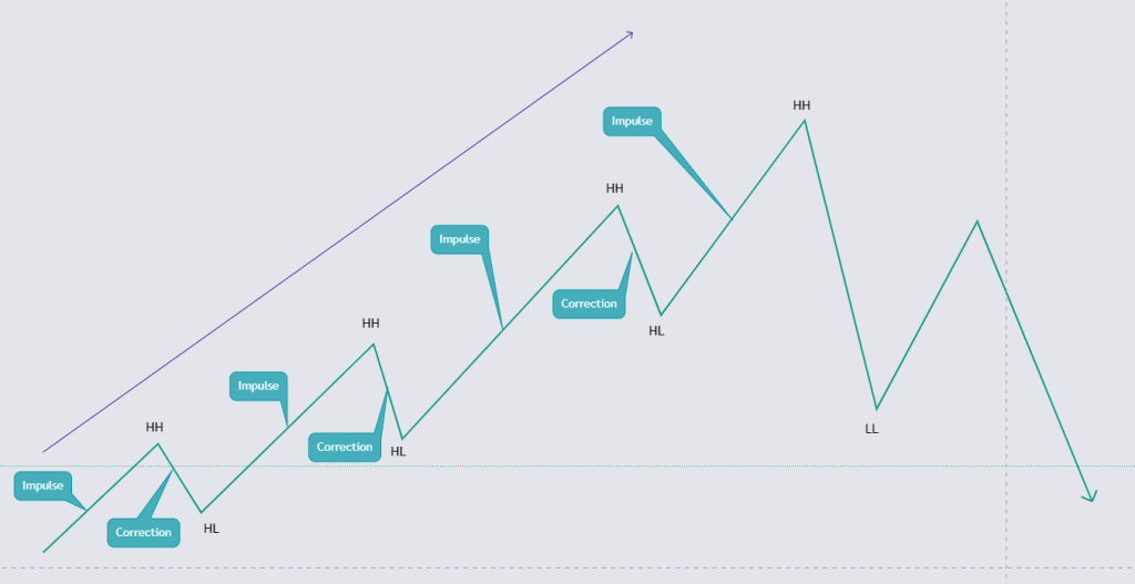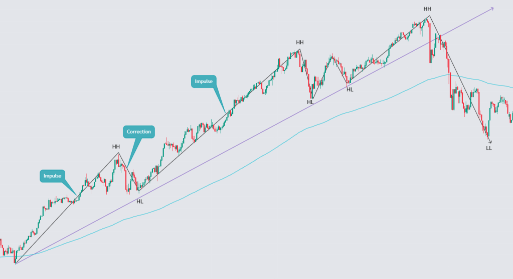 Trong thị trường giá tăng, giá liên tục lập những đỉnh giá mới cao hơn đỉnh giá trước đó (HH- Higher High), và đáy mới cao hơn đáy trước đó (HL – Higher Low). Trong khi giá đang đi lên ta gọi đó là sóng đẩy giá lên (Impulse), khi giá lên đến một độ cao nhất định sẽ có một cơ số người cảm thấy lợi nhuận đã đủ tốt và họ tiến hành chốt lãi khiến giá rơi vào sóng hiệu chỉnh (Correction).