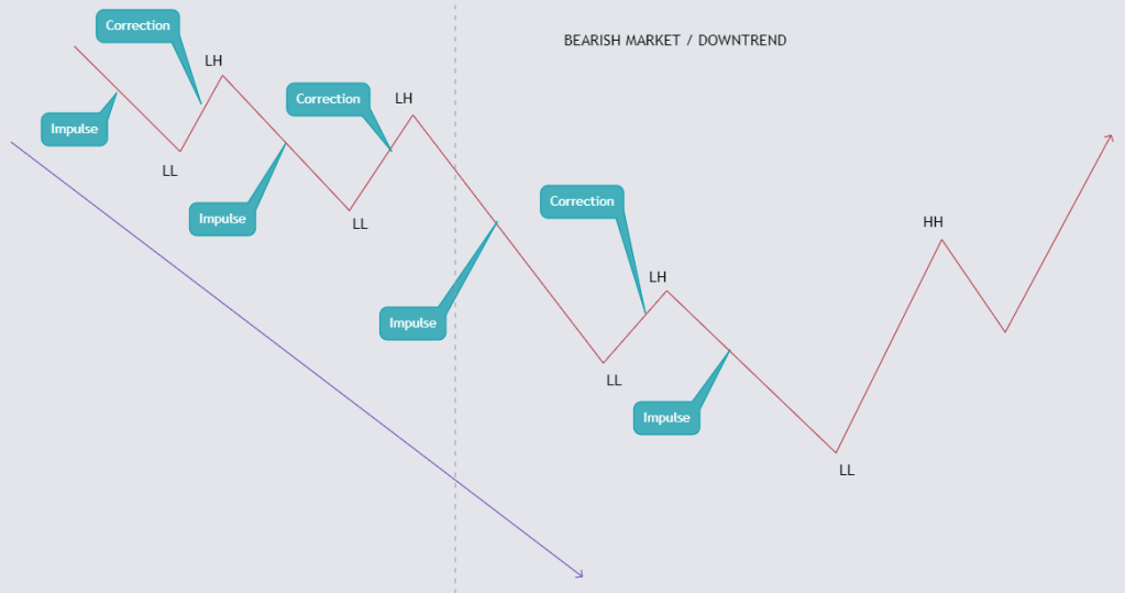 Thị trường giá xuống trái ngược hoàn toàn với thị trường giá lên. Trong downtrend market, giá liên tục lập những đáy giá mới thấp hơn đáy giá trước đó (LL – Lower Low), và đỉnh mới thấp hơn đỉnh trước đó (LH – Lower High). Trong khi giá đang đi xuống ta gọi là sóng giảm giá (Impulse), khi giá rơi xuống một mức nào đó sẽ có một cơ số người short phía trên cảm thấy lợi nhuận đã đủ và tiến hành buy lại để đóng vị thế, hay nhiều người cảm thấy giá đã đủ rẻ để tiến hành mua vào, lúc này giá tăng lại và tạo sóng hồi (Correction).