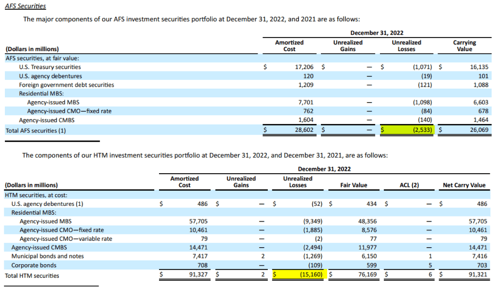 Khoản lỗ chưa thực hiện của SVB trên danh mục đầu tư chứng khoán vào cuối năm 2022, hay chênh lệch giữa giá vốn của các khoản đầu tư và giá trị hợp lý của chúng đã lên tới 17 tỷ USD.