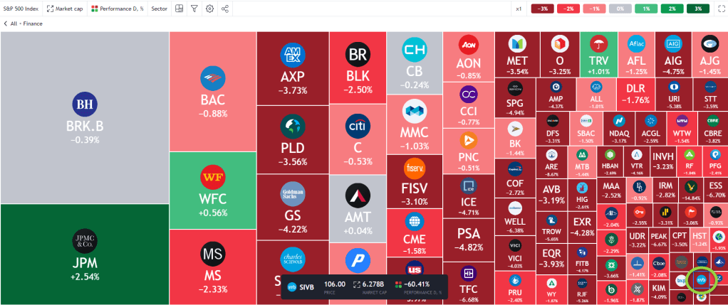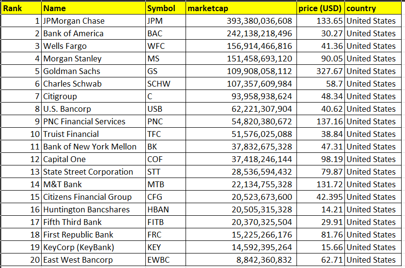 Theo mình SVB sẽ không là Lehman thứ 2. Vào năm 2008 Lehman sụp với tổng tài sản trong bảng cân đối là hơn 300 tỷ USD, thời điểm đó Lehman là nhà băng top đầu của Mỹ, nhưng trước khi SVB sụp nó chỉ đứng thứ 16 thôi. So với những bank top đầu của Mỹ hiện tại thì thực ra nó cũng nhỏ thôi. Vào hôm thứ 6 giảm 60% hãy xem heatmap nhóm tài chính ảnh hưởng chỉ số nó chỉ là 1 ô vuông bé mà thôi. Và khoảng cách vốn hóa so với các bank dẫn đầu là rất xa (bảng dưới là danh sách 20 bank lớn nhất Mỹ hiện tại, sau khi đã bỏ ra SVB ở vị trí 16 ở trước đó).
