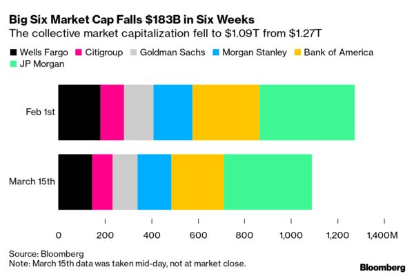 Tổng vốn hóa thị trường của 6 ngân hàng lớn nhất nước Mỹ đã giảm 183 tỷ USD kể từ ngày 01/02/2023 khi chịu tác động từ SVB, Signature, và mới đây nhất là Credit Suisse từ Châu Âu.