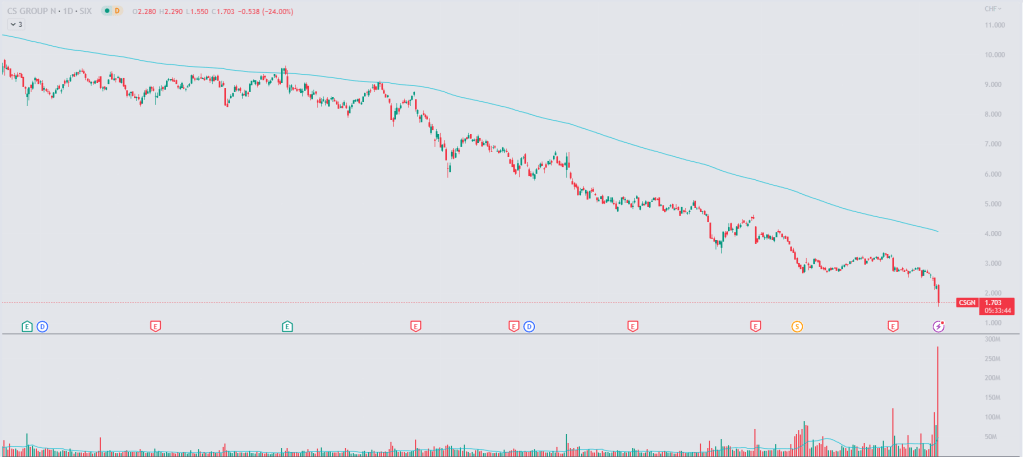 Credit Suisse đóng cửa giảm 24%, đây là mức giảm mạnh nhất và là mức giá thấp nhất từ trước tới giờ. Hơn 280 triệu cổ phiếu được trao tay, cũng là khối lượng nhiều nhất từ trước đến nay.