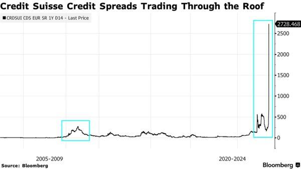 CDS (Hợp đồng hoán đổi rủi ro tín dụng) của CS đã tăng lên rất mạnh, và đạt tới 2700bps, gợi nhớ lại những ngày tồi tệ ở cuộc khủng hoảng 2008. Nếu các bạn còn nhớ thì vào tháng 10 năm ngoái (đó là ngày cuối tuần), Credit Suisse cũng làm spike up cái chart CDS này lên, và chỉ ở mức 600bps, nhưng mà hôm nay nó nhảy lên tới 2700bps.