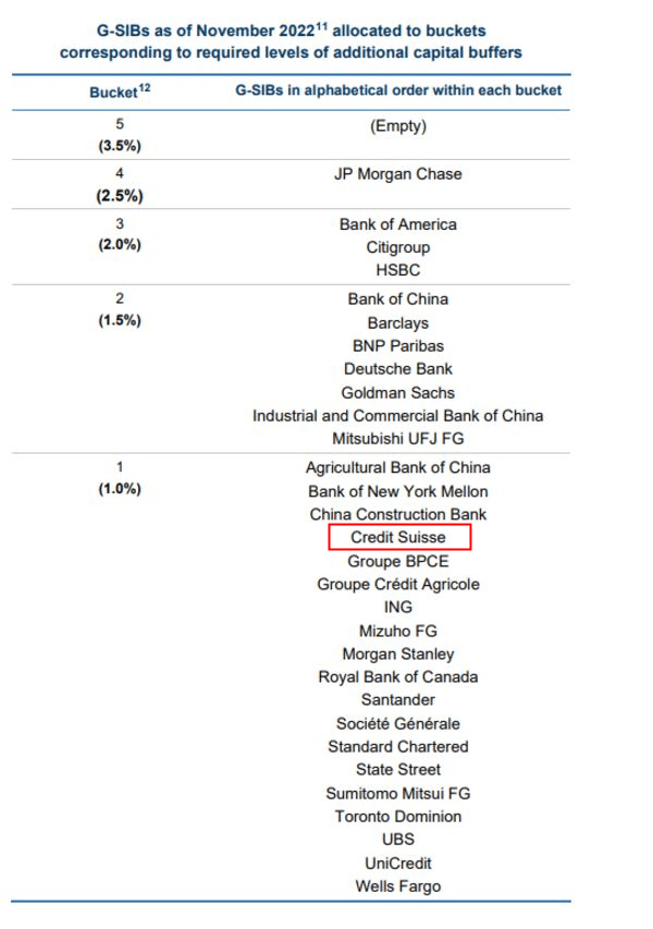 Credit Suisse là một trong 30 ngân hàng được các cơ quan quản lý quốc tế cho rằng là rất quan trọng đối với hệ thống tài chính toàn cầu, mà họ cần nắm giữ thêm cổ phần và đáp ứng các tiêu chuẩn khác. Danh sách 30 ngân hàng này được tạo ra kể từ sau cuộc khủng hoảng kinh tế thế giới, và sẽ được hiệu chỉnh mỗi năm.