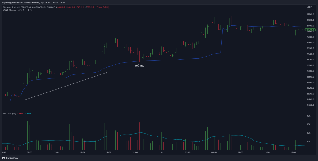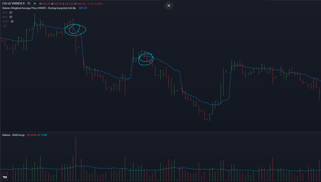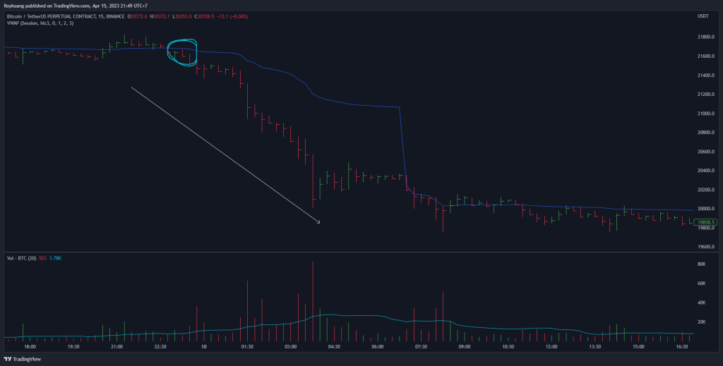 Ngoài ra VWAP cũng cho phép bản thân suy nghĩ thấu đáo hơn khi thực hiện giao dịch. Ví dụ nếu như bán khống thì nên chọn khi nào đang có xu hướng giảm và giá giao dịch bên dưới VWAP, hay khi giá vừa rơi qua VWAP với một cây nến lớn kèm vol cao, bạn có thể vào lệnh short (không đuổi lệnh) hoặc chờ đợi điểm test lại VWAP.