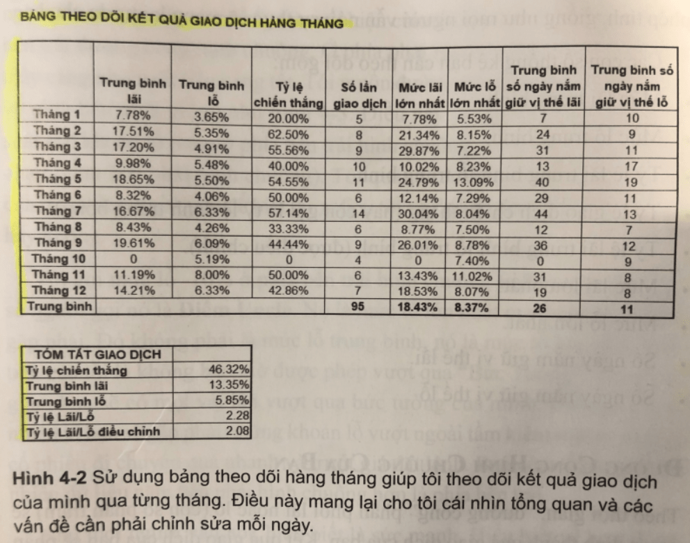 Bạn nên có một bảng excel ghi chép rõ ràng thành quả giao dịch của chính mình. Không những chỉ ghi các giao dịch bạn nhớ mà phải ghi chép toàn bộ giao dịch. Hãy ghi lại bạn mua mức giá nào, bán ra ở mức giáo bao nhiêu, quy mô giao dịch thế nào, nắm giữ bao lâu cho từng giao dịch. Rất nhanh sau đó, bạn sẽ biết được mức lãi trung bình và mức lỗ trung bình, cũng như tỷ lệ giao dịch chiến thắng và thua lỗ.