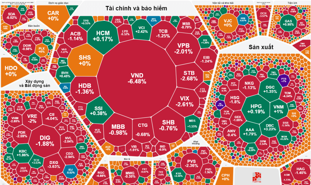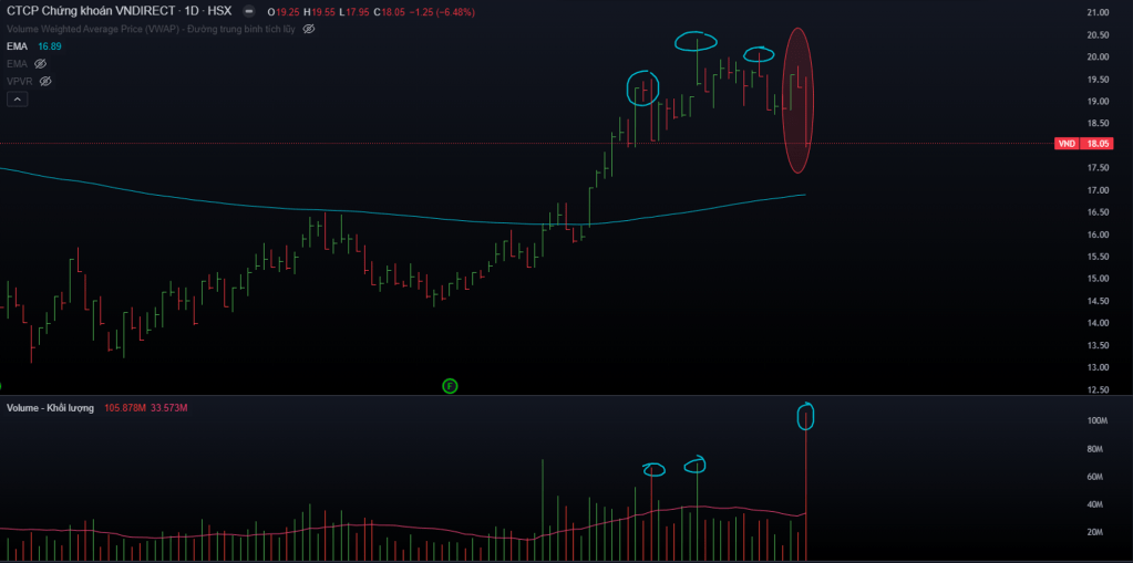 Giao dịch mạnh mẽ nhất phải nói tới VND, khi hơn 105tr cổ phiếu được sang tay, chiếm 8.6% tổng lượng cổ phiếu lưu hành. Đây cũng là mức giao dịch kỷ lục của VND trên sàn nói chung. Ngay khi vừa vào phiên chiều VND đã sụt giảm bởi những khối lệnh bán ra khá lớn, có lệnh lên tới gần 2tr cổ, việc lực bán ra quá lớn và đột ngột khiến lực mua không đỡ được nên VND mất giá rất nhanh. Chung quy cũng là một phần nội tại của VND với trái phiếu Trung Nam, và mới đây một công ty con của Trung Nam đã xin lùi ngày thanh toán nợ trái phiếu trị giá 1500 tỷ.