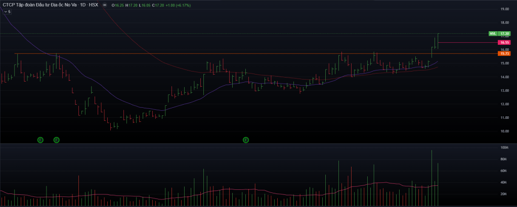 - Nổi bật nhất với NVL tăng trần, NVL là cổ phiếu có thể chú ý đến khi thanh khoản các phiên gần đây khá mạnh, giá vừa bứt thoát khỏi 15.7. Vùng giải ngân ổn ở 16.1-16.5, nếu giải ngân giá cao hơn đòi hỏi dao động không quá mạnh và có xu hướng tích lũy lại từ 3-5 phiên.