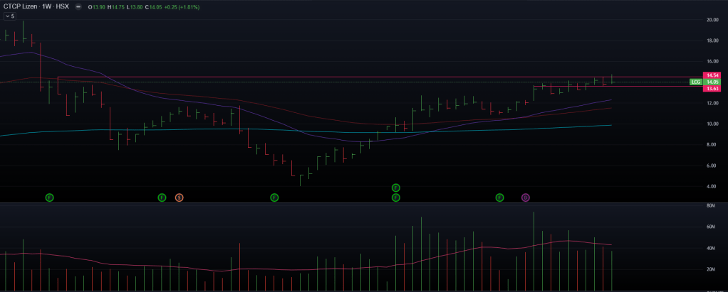 - LCG đang tích lũy lại trong vùng giá 12.9-14.5