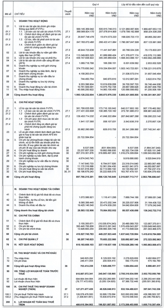 – Trong Q4 thì lợi nhuận từ FVTPL khoảng 618 tỷ với khoản cổ tức, tiền lãi đóng góp trọng yếu. Lãi từ cho vay margin và ứng trước tiền bán là 439 tỷ. Lợi nhuận từ môi giới chỉ 17 tỷ.