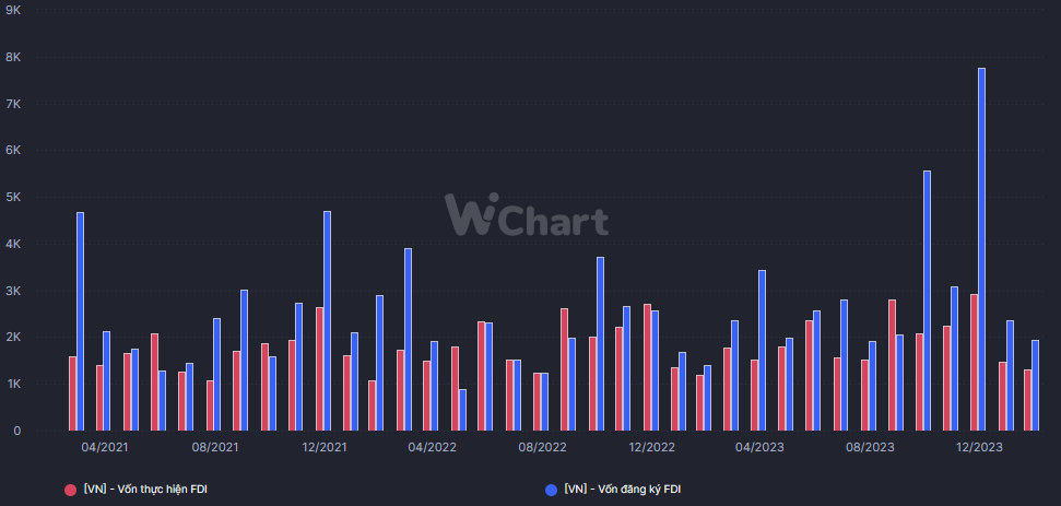 Trong 2 tháng đầu năm, vốn FDI thực hiện ước đạt 2.8 tỷ USD, vốn FDI đăng ký đạt 4.3 tỷ USD.