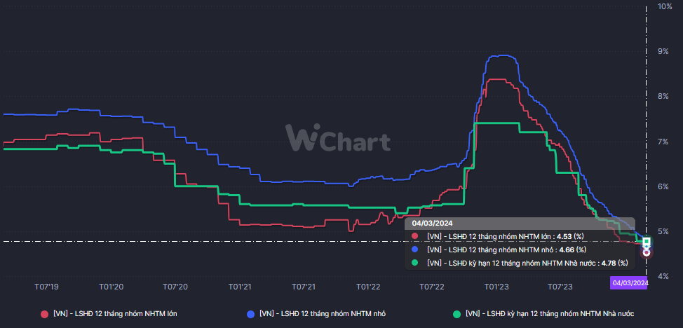 Lãi suất huy động kỳ hạn 12T của các ngân hàng đạt mức thấp nhất kể từ 2015 đến nay. Lãi huy động nằm trong khoảng 4.5-4.8% / năm.