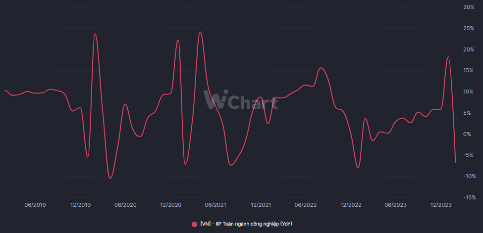 IIP toàn ngành công nghiệp 2 tháng tăng 5.7%, trong đó tháng 1 tăng 18.26% so với tháng 1 năm ngoái, tháng 2 giảm 6.81% (do Tết nguyên đán). Trong 2 tháng đầu năm, IIP ngành công nghiệp chế biến & chế tạo tăng 5.9%, và ngành sản xuất phân phối điện năng tăng 12.2%.