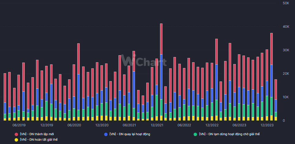 Trong tháng 2, tổng số doanh nghiệp (DN) tạm dừng hoạt động và DN giải thể giảm nhẹ so với cùng kỳ, tổng số DN thành lập mới tăng nhẹ.