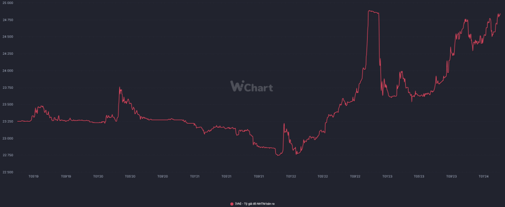 Tỷ giá có xu hướng tăng lại từ đầu tháng 12 năm ngoái sau cú điều chỉnh từ tháng 10. Hiện tại tỷ giá ngày hôm nay (04/03/2024) đang là 24,840 VND, tiệm cận với vùng đỉnh năm 2022. Tỷ giá gặp áp lực là do: