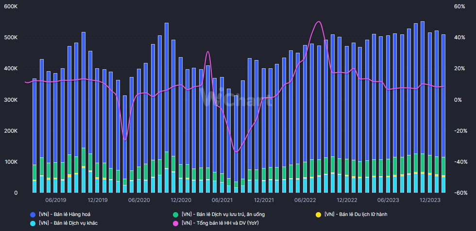 Trong 2 tháng đầu năm 2024, tổng giá trị bán lẻ hàng hóa và dịch vụ đạt khoảng 1 triệu tỷ đồng, nếu so với 2 tháng năm 2023 thì mức giá trị này tăng 8.5%. Tính riêng tháng 2 , tổng giá trị bán lẻ HH&DV đạt 509.7k tỷ (tăng 8.49% so với cùng kỳ). Mặc dù tháng 2 là tháng có tết nguyên đán nhưng nhu cầu thường tăng trước tết và giảm sau tết khiến giá trị này trung hòa lại. Nhìn chung cầu tiêu dùng trong 2 tháng như thế là được, cũng không đến nỗi quá yếu.